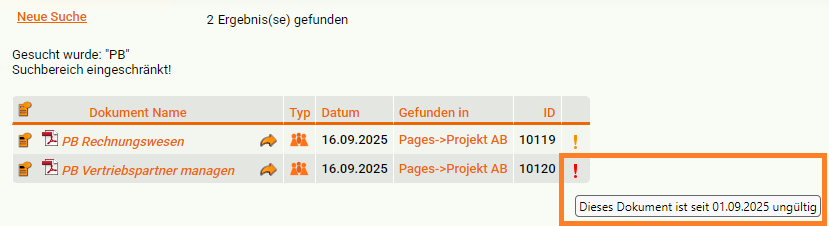 Weiters werden nun auch – analog zum Ablauf von gelenkten Dokumenten – sowohl direkt im Plattformmodul also auch im Suchergebnis rote und orange Rufzeichen angezeigt: