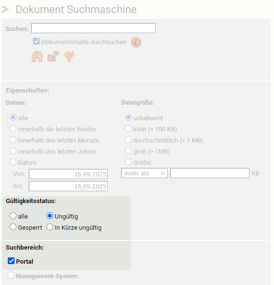 Mit der gegenständlichen Erweiterung haben die Einschränkung nach dem Gültigkeitsstatus in der Suche auch auf Plattformdokumente erweitert. Das heißt auch Plattformdokumente können nun nach dem Status „Ungültig“ oder „In kürze ungültig“ gesucht werden.
